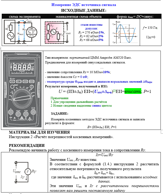 Измерение ЭДС источника сигнала ИСХОДНЫЕ ДАННЫЕ: схема экспериментаэквивалентная схема объектаформа uвых= DC+синус: стали известны допуски: R1 = 270 кОм±1%, R2 = 62 кОм±2% R3 = 68 кОм±5% f = 150 Гц. UDC=0 Тип измерителя: портативный ЦММ Amprobe AM520 Euro. Предназначен для измерений синусоидальных сигналов. … - значение сопротивления RV = 10 МОм±10%; - значение ёмкости СV = 0 пФ; - температура среды Θсреды входит в диапазон нормальных значений ∆Θнорм Результат измерения, полученный в ИЗ1: U = (ИЗ±∆п) ЕИ(Uотс±∆о.п)1)ЕИ=вписать; Р=1 Примечания 1 Для упрощения дальнейших расчётов 2 Новые сведения выделены синим цветом ЗАДАНИЕ: Измерить косвенным методом ЭДС источника сигнала и записать результат в формате: Е= (ИЗ±∆п.) ЕИ; Р=1 МАТЕРИАЛЫ ДЛЯ ИЗУЧЕНИЯ Инструкция 2 «Расчёт погрешностей косвенных измерений».