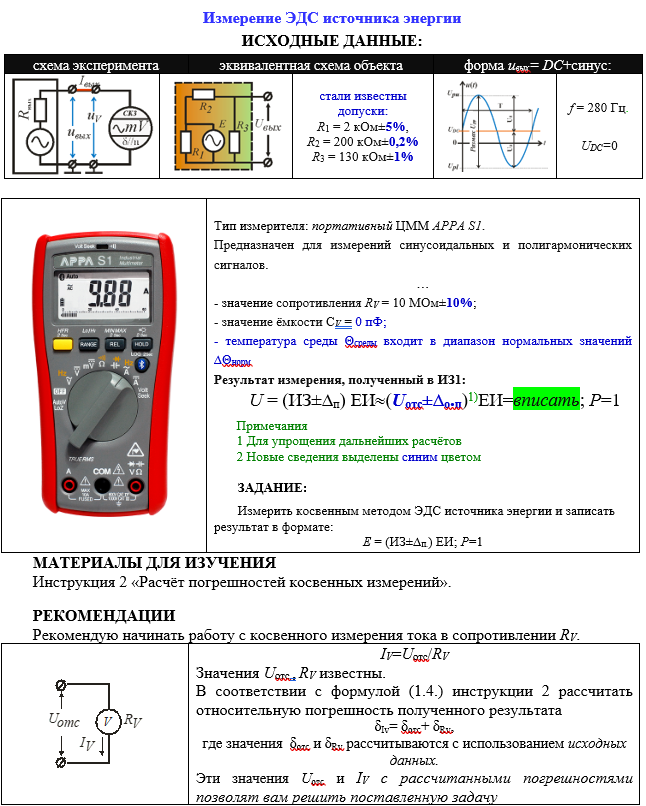 Измерение ЭДС источника энергии ИСХОДНЫЕ ДАННЫЕ: схема экспериментаэквивалентная схема объектаформа uвых= DC+синус: стали известны допуски: R1 = 2 кОм±5%, R2 = 200 кОм±0,2% R3 = 130 кОм±1% f = 280 Гц. UDC=0 Тип измерителя: портативный ЦММ APPA S1. Предназначен для измерений синусоидальных и полигармонических сигналов. … - значение сопротивления RV = 10 МОм±10%; - значение ёмкости СV = 0 пФ; - температура среды Θсреды входит в диапазон нормальных значений ∆Θнорм Результат измерения, полученный в ИЗ1: U = (ИЗ±∆п) ЕИ(Uотс±∆о.п)1)ЕИ=вписать; Р=1 Примечания 1 Для упрощения дальнейших расчётов 2 Новые сведения выделены синим цветом ЗАДАНИЕ: Измерить косвенным методом ЭДС источника энергии и записать результат в формате: Е = (ИЗ±∆п.) ЕИ; Р=1 МАТЕРИАЛЫ ДЛЯ ИЗУЧЕНИЯ Инструкция 2 «Расчёт погрешностей косвенных измерений».
