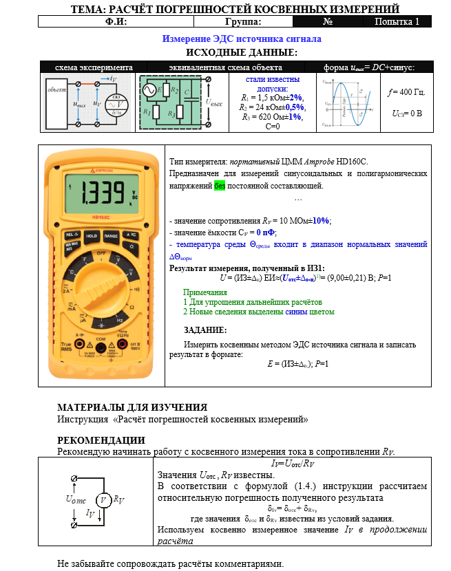 Для студентов ИДДО НИУ «МЭИ» по предмету Метрология и информационно-измерительная техникаТиповое задание к теме косвенные измеренияТиповое задание к теме косвенные измерения