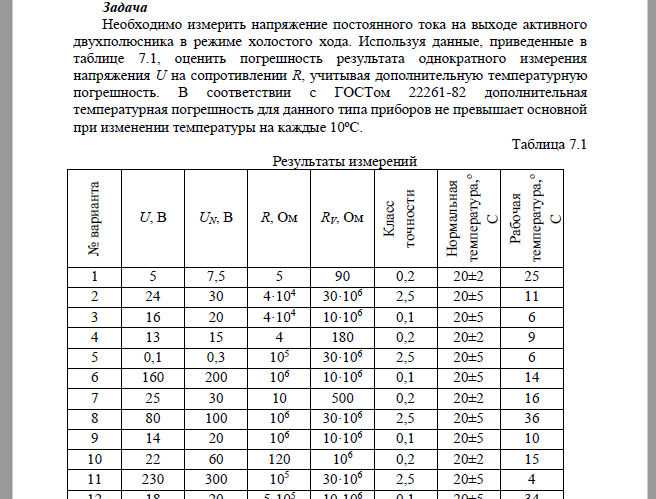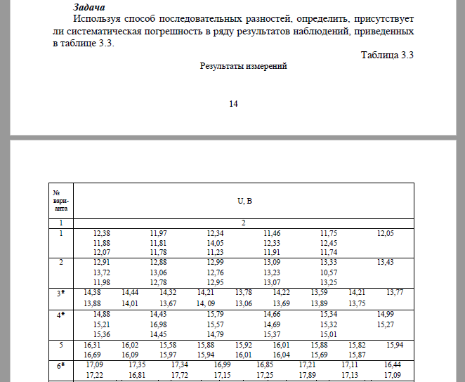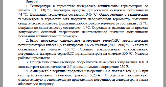 Показать/скрыть дополнительное описаниеКГУ; Обработка результатов измерений; 1. Расчет погрешностей средств измерений 2. Влияние методических погрешностей на результаты измерений 3. Обнаружение и исключение систематических погрешностей 4. Вероятностное описание случайных погрешностей 5. Грубые погрешности и методы их исключения 6. Обработка результатов прямых многократных измерений 7. Прямые однократные измерения 8. Обработка результатов косвенных измерений В контрольной работе необходимо решить 8 задач: по одной задаче из каждого раздела. Номер варианта заданий выбирается по последней цифре номера зачетной книжки.