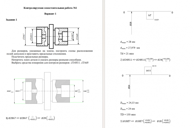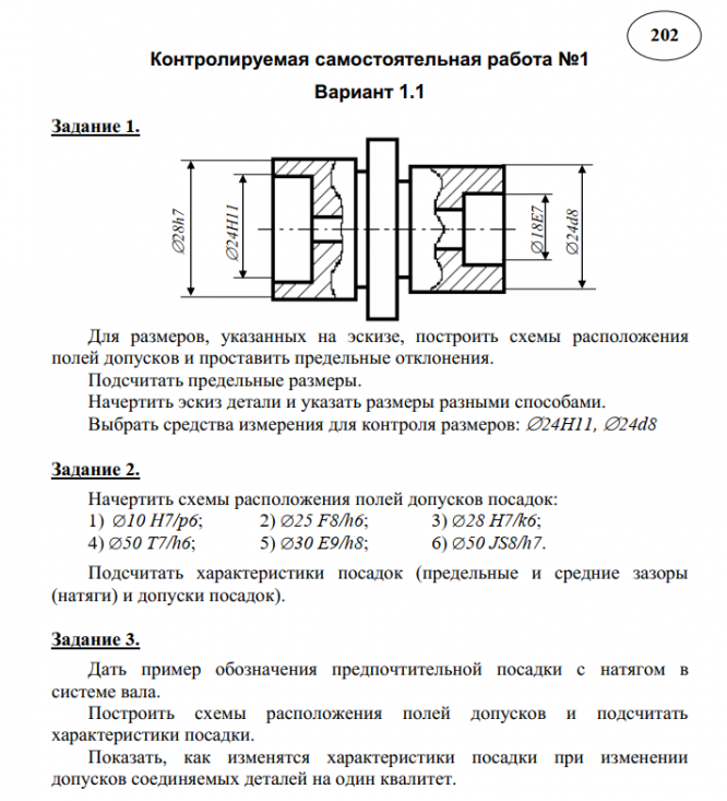 Задание 1. Для размеров, указанных на эскизе, построить схемы расположения полей допусков и проставить предельные отклонения. Подсчитать предельные размеры. Начертить эскиз детали и указать размеры разными способами. Выбрать средства измерения для контроля размеров: 24H11, 24d8 Задание 2. Начертить схемы расположения полей допусков посадок: 1) 10 Н7/p6; 2) 25 F8/h6; 3) 28 H7/k6; 4) 50 T7/h6; 5) 30 E9/h8; 6) 50 JS8/h7. Подсчитать характеристики посадок (предельные и средние зазоры (натяги) и допуски посадок). Задание 3. Дать пример обозначения предпочтительной посадки с натягом в системе вала. Построить схемы расположения полей допусков и подсчитать характеристики посадки.