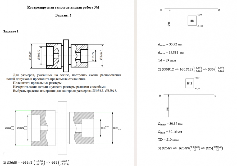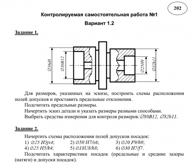 Задание 1. Для размеров, указанных на эскизе, построить схемы расположения полей допусков и проставить предельные отклонения. Подсчитать предельные размеры. Начертить эскиз детали и указать размеры разными способами. Выбрать средства измерения для контроля размеров : 30B12, 32h11. Задание 2. Начертить схемы расположения полей допусков посадок: 1) 25 H5js4 ; 2) 50 Н7/s6 ; 3) 20 F9/h9 ; 4) 25 Н5/k4 ; 5) 18U8/h8 ; 6) 30 H7/f7 . Подсчитать характеристики посадок (предельные и средние зазоры (натяги) и допуски посадок). Задание 3. Дать пример обозначения предпочтительной переходной посадки в системе отверстия. Построить схемы расположения полей допусков и подсчитать характеристики посадки.