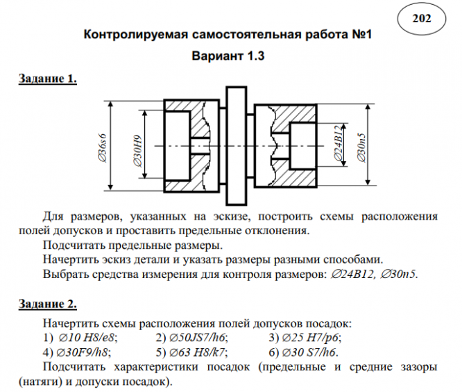 Задание 1. Для размеров, указанных на эскизе, построить схемы расположения полей допусков и проставить предельные отклонения. Подсчитать предельные размеры. Начертить эскиз детали и указать размеры разными способами. Выбрать средства измерения для контроля размеров: 24B12, 30n5. Задание 2. Начертить схемы расположения полей допусков посадок: 1) 10 H8/e8 ; 2) 50JS7/h6 ; 3) 25 H7/p6 ; 4) 30F9/h8 ; 5) 63 H8/k7 ; 6) 30 S7/h6 . Подсчитать характеристики посадок (предельные и средние зазоры (натяги) и допуски посадок). Задание 3. Дать пример обозначения предпочтительной посадки с зазором в системе вала. Построить схемы расположения полей допусков и подсчитать характеристики посадки.