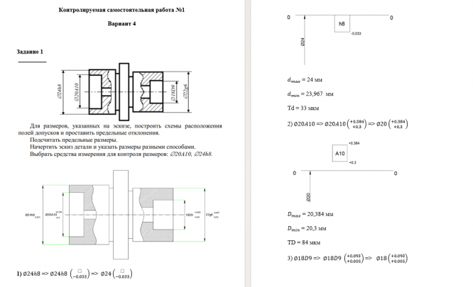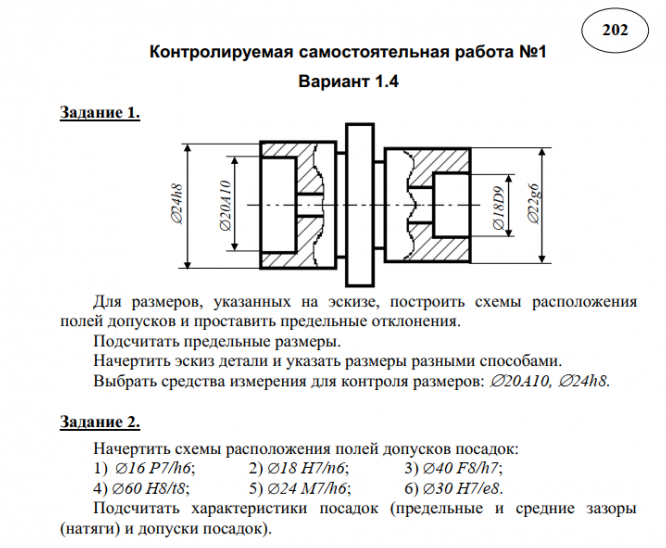 Задание 1. Для размеров, указанных на эскизе, построить схемы расположения полей допусков и проставить предельные отклонения. Подсчитать предельные размеры. Начертить эскиз детали и указать размеры разными способами. Выбрать средства измерения для контроля размеров: 20A10, 24h8. Задание 2. Начертить схемы расположения полей допусков посадок: 1) 16 P7/h6 ; 2) 18 H7/n6 ; 3) 40 F8/h7 ; 4) 60 H8/t8 ; 5) 24 M7/h6 ; 6) 30 H7/e8 . Подсчитать характеристики посадок (предельные и средние зазоры (натяги) и допуски посадок). Задание 3. Дать пример обозначения предпочтительной посадки с натягом в системе отверстия. Построить схемы расположения полей допусков и подсчитать характеристики посадки.
