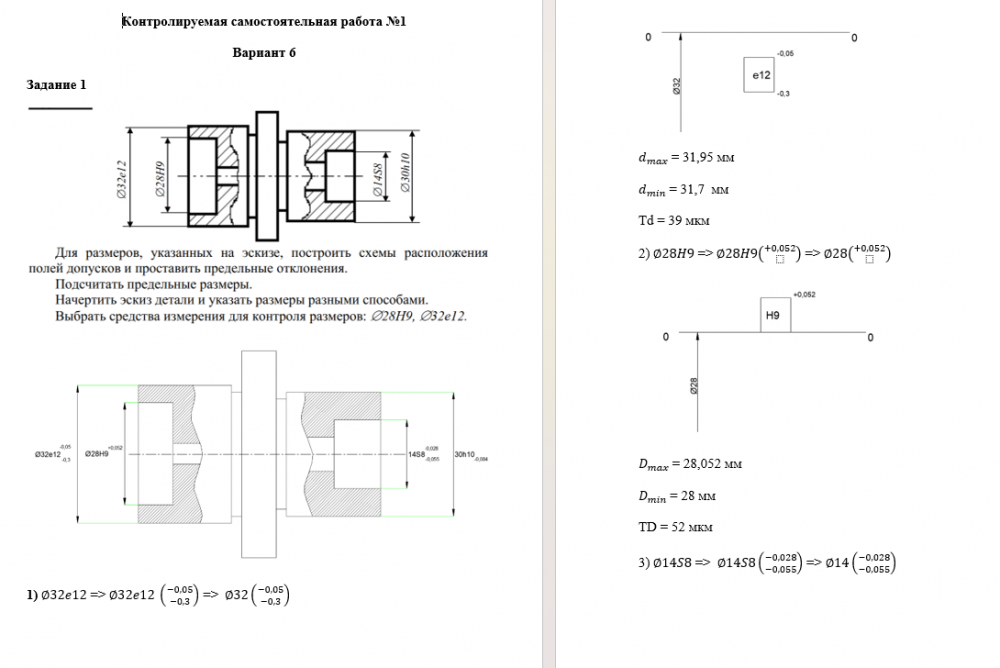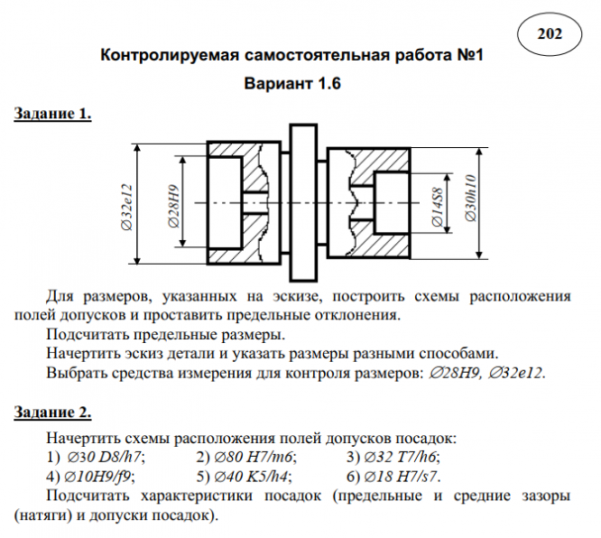 Задание 1. Для размеров, указанных на эскизе, построить схемы расположения полей допусков и проставить предельные отклонения. Подсчитать предельные размеры. Начертить эскиз детали и указать размеры разными способами. Выбрать средства измерения для контроля размеров:  28H9,  32e12. Задание 2. Начертить схемы расположения полей допусков посадок: 1)  3 0 D8/h7 ; 2)  80 H7/m6 ; 3)  32 T7/h6 ; 4)  10H9/f9 ; 5)  40 K5/h4 ; 6)  18 H7/s7 . Подсчитать характеристики посадок (предельные и средние зазоры (натяги) и допуски посадок). Задание 3. Дать пример обозначения предпочтительной переходной посадки в системе отверстия. Построить схемы расположения полей допусков и подсчитать характеристики посадки.