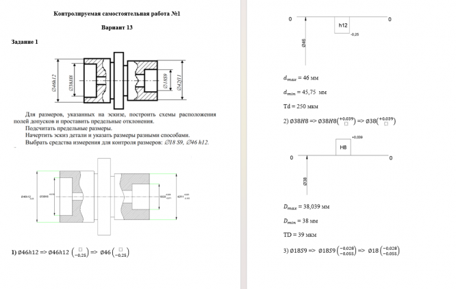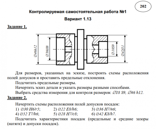 Задание 1. Для размеров, указанных на эскизе, построить схемы расположения полей допусков и проставить предельные отклонения. Подсчитать предельные размеры. Начертить эскиз детали и указать размеры разными способами. Выбрать средства измерения для контроля размеров: 18 S9, 46 h12. Задание 2. Начертить схемы расположения полей допусков посадок: 1) 30 H6/r5 ; 2) 22 E8/h6 ; 3) 36 H7/n6 ; 4) 52 T7/h6 ; 5) 28 H7/c8 ; 6) 42 K8/h7 . Подсчитать характеристики посадок (предельные и средние зазоры (натяги) и допуски посадок). Задание 3. Дать пример обозначения предпочтительной посадки с натягом в системе вала. Построить схемы расположения полей допусков и подсчитать характеристики посадки.