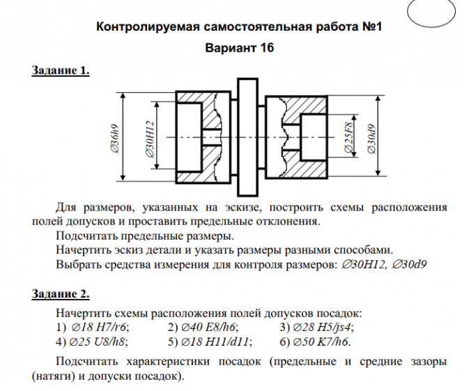 Задание 1. Для размеров, указанных на эскизе, построить схемы расположения полей допусков и проставить предельные отклонения. Подсчитать предельные размеры. Начертить эскиз детали и указать размеры разными способами. Выбрать средства измерения для контроля размеров: 30H12, 30d9 Задание 2. Начертить схемы расположения полей допусков посадок: 1) 18 Н7/r6 ; 2) 40 Е8/h6 ; 3) 28 H5/js4 ; 4) 25 U8/h8 ; 5) 18 H11/d11 ; 6) 50 K7/h6 . Подсчитать характеристики посадок (предельные и средние зазоры (натяги) и допуски посадок). Задание 3. Дать пример обозначения предпочтительной посадки с зазором в системе отверстия. Построить схемы расположения полей допусков и подсчитать характеристики посадки.