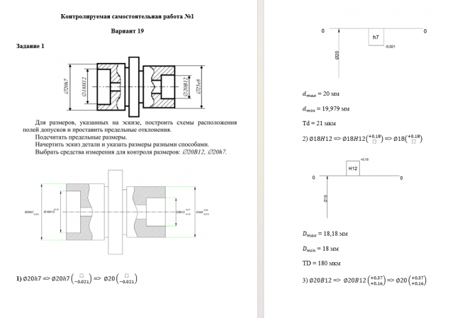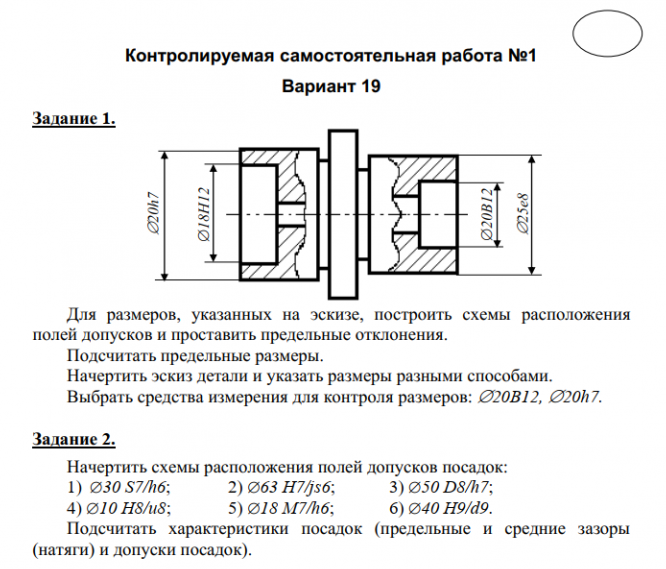 Задание 1. Для размеров, указанных на эскизе, построить схемы расположения полей допусков и проставить предельные отклонения. Подсчитать предельные размеры. Начертить эскиз детали и указать размеры разными способами. Выбрать средства измерения для контроля размеров: 20B12, 20h7. Задание 2. Начертить схемы расположения полей допусков посадок: 1) 30 S7/h6 ; 2) 63 H7/js6 ; 3) 50 D8/h7 ; 4) 10 H8/u8 ; 5) 18 M7/h6 ; 6) 40 H9/d9 . Подсчитать характеристики посадок (предельные и средние зазоры (натяги) и допуски посадок). Задание 3. Дать пример обозначения предпочтительной посадки с зазором в системе вала. Построить схемы расположения полей допусков и подсчитать характеристики посадки.