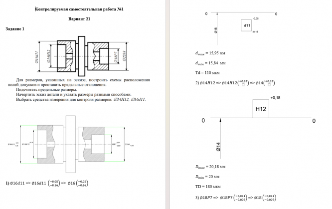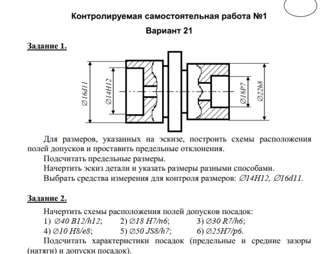 Задание 1. Для размеров, указанных на эскизе, построить схемы расположения полей допусков и проставить предельные отклонения. Подсчитать предельные размеры. Начертить эскиз детали и указать размеры разными способами. Выбрать средства измерения для контроля размеров: 14H12, 16d11. Задание 2. Начертить схемы расположения полей допусков посадок: 1) 40 B12/h12 ; 2) 18 H7/n6 ; 3) 30 R7/h6 ; 4) 10 H8/e8 ; 5) 50 JS8/h7 ; 6) 25H7/p6 . Подсчитать характеристики посадок (предельные и средние зазоры (натяги) и допуски посадок). Задание 3. Дать пример обозначения предпочтительной переходной посадки в системе вала. Построить схемы расположения полей допусков и подсчитать характеристики посадки.