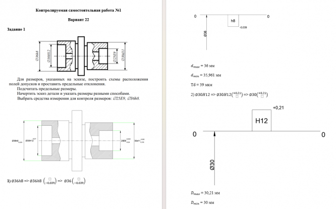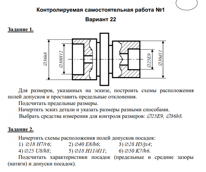 Задание 1. Для размеров, указанных на эскизе, построить схемы расположения полей допусков и проставить предельные отклонения. Подсчитать предельные размеры. Начертить эскиз детали и указать размеры разными способами. Выбрать средства измерения для контроля размеров: 25E9, 36h8. Задание 2. Начертить схемы расположения полей допусков посадок: 1) 18 Н7/r6 ; 2) 40 Е8/h6 ; 3) 28 H5/js4 ; 4) 25 U8/h8 ; 5) 18 H11/d11 ; 6) 50 K7/h6 . Подсчитать характеристики посадок (предельные и средние зазоры (натяги) и допуски посадок). Задание 3. Дать пример обозначения предпочтительной посадки с зазором в системе отверстия. Построить схемы расположения полей допусков и подсчитать характеристики посадки.