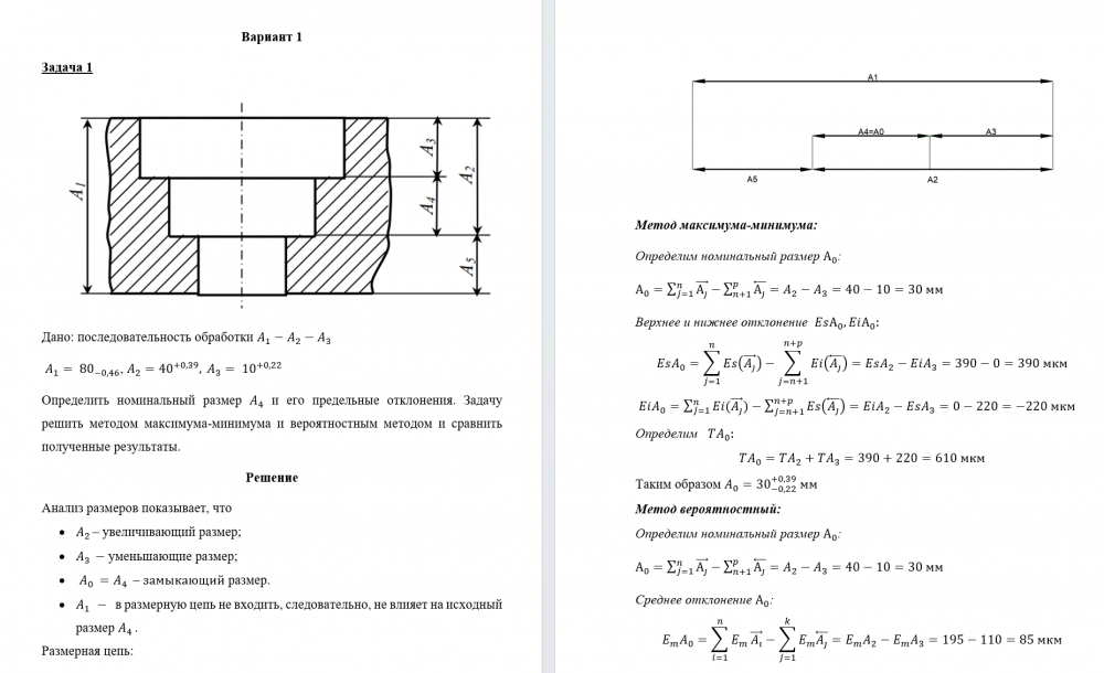 Задача 1. Дано: последовательность обработки А1 – А2 – А3. А1 = 800-0,46; А2 = 400+0,39; А3 = 100+0,22. Определить номинальный размер А4 и его предельные отклонения. Задачу решить методом максимумаминимума и вероятностным методом и сравнить полученные результаты. Задача 2. Определить номинальный размер D1 отверстия в заготовке и его предельные отклонения, если после нанесения покрытия толщиной S = 20…35 мкм отверстие должно иметь размер D2 = 60H8. Решить задачу методом максимумаминимума. Примечание: номинальный размер толщины покрытия S принять равным 0. Задача 3. Дано: А1 = 100 мм; А2 = 90 мм; А3 = 10 мм. Обеспечить зазор S между торцами зубчатого колеса и простановочного кольца механизма в пределах 0,25…0,40 мм. Задачу решить методом максимума-минимума и вероятностным методом и полученные результаты сравнить. А4 А1 А3 А5 А2 D2 D1 S А2 А3  А S 1Задача 4. Дано: последовательность обработки А1 – А2 – А4. А2 = А4 = 45 Н7; А3 = 80 js10. Определить номинальный размер А1 и его предельные отклонения. Задачу решить методом максимумаминимума и вероятностным методом и сравнить полученные результаты. Задача 5. Дано: А1 = 75 H12; А2 = 9 h9; А3 = 63 h9. Определить размеры компенсатора А4, чтобы зазор S находился в пределах 0,3…0,4 мм. Примечание: номинальный размер зазора S принять равным 0. Задача 6. Определить глубину фрезерования шпоночного паза z и ее предельные отклонения, учитывая, что после шлифования вала по размеру d2 = 86 00,,025 003 должен быть получен размер L = 820-0,14. Размер вала до шлифования d1 = 9000,06 . Решить задачу методом максимумаминимума. А2 А3 А4 А1  S А1 А2 А3 А4 d