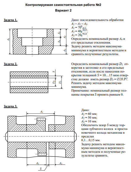 Контролируемая самостоятельная работа №2 Вариант 2 Задача 1. Дано: последовательность обработки А1 – А2 – А3. А1 = 700-0,3; А2 = 400+0,25; А3 = 200+0,13. Определить номинальный размер А4 и его предельные отклонения. Задачу решить методом максимумаминимума и вероятностным методом и сравнить полученные результаты. Задача 2. Определить номинальный размер D1 отверстия в заготовке и его предельные отклонения, если после нанесения покрытия толщиной S = 10…15 мкм отверстие должно иметь размер D2 = 20 P7. Решить задачу методом максимумаминимума. Примечание: номинальный размер толщины покрытия S принять равным 0. Задача 3. Дано: А1 = 60 мм; А2 = 50 мм; А3 = 10 мм. Обеспечить зазор S между торцами зубчатого колеса и простановочного кольца механизма в пределах 0,1…0,15 мм.