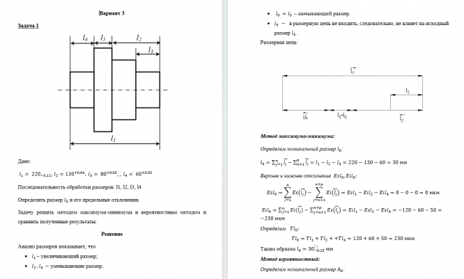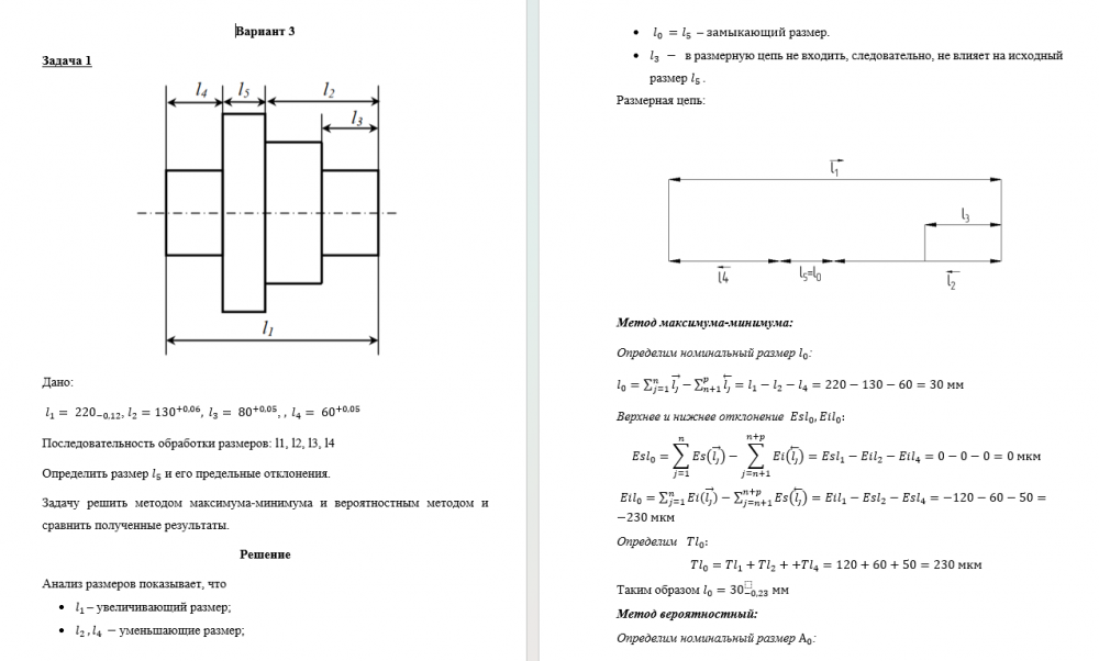 Контролируемая самостоятельная работа №2 Вариант 3 Задача 1. Дано: последовательность обработки А1 – А2 – А3. А1 = 1000-0,14; А2 = 500+0,1; А3 = 200+0,08. Определить номинальный размер А4 и его предельные отклонения. Задачу решить методом максимумаминимума и вероятностным методом и сравнить полученные результаты. Задача 2. Определить номинальный размер D1 отверстия в заготовке и его предельные отклонения, если после нанесения покрытия толщиной S = 20…25 мкм отверстие должно иметь размер D2 = 48 H7. Решить задачу методом максимумаминимума. Примечание: номинальный размер толщины покрытия S принять равным 0. Задача 3. Дано: А1 = 75 мм; А2 = 60 мм; А3 = 15 мм. Обеспечить зазор S между торцами зубчатого колеса и простановочного кольца механизма в пределах 0,1…0,2 мм. Задачу решить методом максимума-минимума и вероятностным методом и полученные результаты сравнить. А4 А1 А3 А5 А2 D2 D1 S А2 А3 А S 1Задача 4. Дано: последовательность обработки А1 – А2 – А4. А2 = А4 = 40 Н7; А3 = 70 js10. Определить номинальный размер А1 и его предельные отклонения. Задачу решить методом максимумаминимума и вероятностным методом и сравнить полученные результаты. Задача 5. Дано: А1 = 140 H10; А2 = 10 h12; А3 = 125 h9. Определить размеры компенсатора А4, чтобы зазор S находился в пределах 0,4…0,5 мм. Примечание: номинальный размер зазора S принять равным 0. Задача 6. Определить глубину фрезерования шпоночного паза z и ее предельные отклонения, учитывая, что после шлифования вала по размеру d2 = 380.01 должен быть получен размер L = 340-0,1. Размер вала до шлифования d1 = 400-0,03. Решить задачу методом максимумаминимума.Показать/скрыть дополнительное описание
