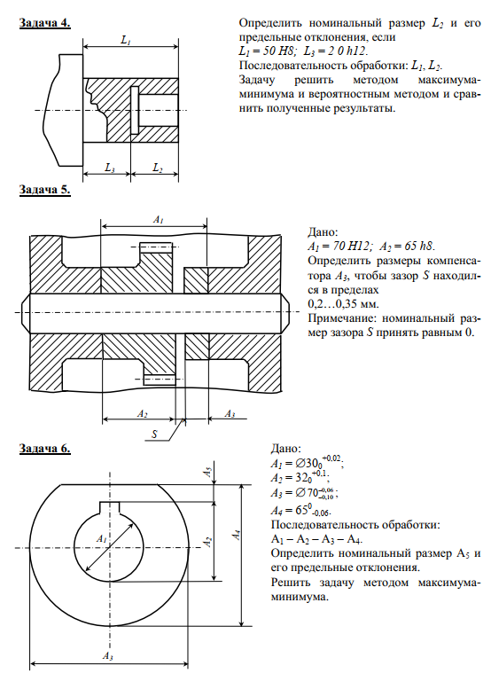Обеспечить зазор S между торцами тяги и простановочного кольца в пределах 0,8…1,0 мм. Задачу решить методом максимумаминимума и вероятностным методом и полученные результаты сравнить. l1 l3 l4 l5 l2 d dзаг S А2 А3 А4 А1  SЗадача 4. Определить номинальный размер L2 и его предельные отклонения, если L1 = 50 H8; L3 = 2 0 h12. Последовательность обработки: L1, L2. Задачу решить методом максимумаминимума и вероятностным методом и сравнить полученные результаты. Задача 5. Дано: А1 = 70 H12; А2 = 65 h8. Определить размеры компенсатора А3, чтобы зазор S находился в пределах 0,2…0,35 мм. Примечание: номинальный размер зазора S принять равным 0. Задача 6. Дано: А1 = 300+0,02; А2 = 320+0,1; А3 = 70 00,,10 06 ; А4 = 650-0,06.