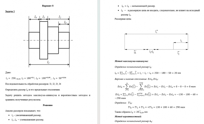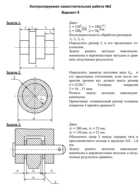Контролируемая самостоятельная работа №2 Вариант 8 Задача 1. Дано: l1 = 2500-0,13; l2 = 1800+0,1; l3 = 1000+0,09; l4 = 500+0,06. Последовательность обработки размеров: l1, l2, l3, l4. Определить размер l5 и его предельные отклонения. Задачу решить методом максимумаминимума и вероятностным методом и сравнить полученные результаты. Задача 2. Определить диаметр заготовки вала dзаг и его предельные отклонения, если после покрытия хромом вал должен иметь размер d = 20u7. Толщина покрытия S = 10…15 мкм. Решить задачу методом максимумаминимума. Примечание: номинальный размер толщины покрытия S принять равным 0. Задача 3. Дано: А1 = 200 мм; А2 = 25 мм; А3 = 150 мм; А4 = 25 мм.