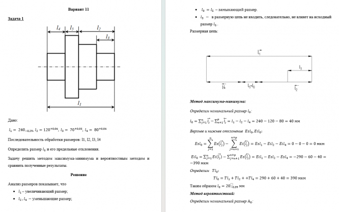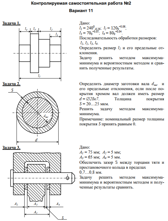 Контролируемая самостоятельная работа №2 Вариант 11 Задача 1. Дано: l 1 = 240 0-0,29 ; l 2 = 120 0+0,06 ; l 3 = 70 0+0,05 ; l 4 = 80 0+0,04 . Последовательность обработки размеров: l 1 , l 2 , l 3 , l 4 . Определить размер l 5 и его предельные отклонения. Задачу решить методом максимумаминимума и вероятностным методом и сравнить полученные результаты. Задача 2. Определить диаметр заготовки вала d заг и его предельные отклонения, если после по крытия хромом вал должен иметь размер d = 28к7 . S = 20…25 мкм. Толщина покрытия Решить задачу методом максимума минимума. Примечание: номинальный размер толщины покрытия S принять равным 0.