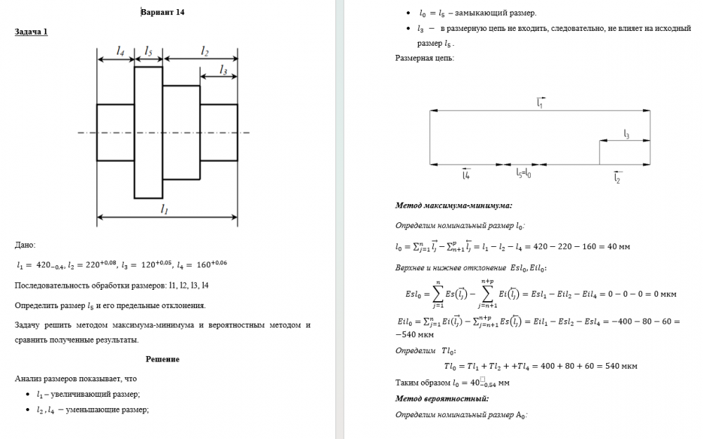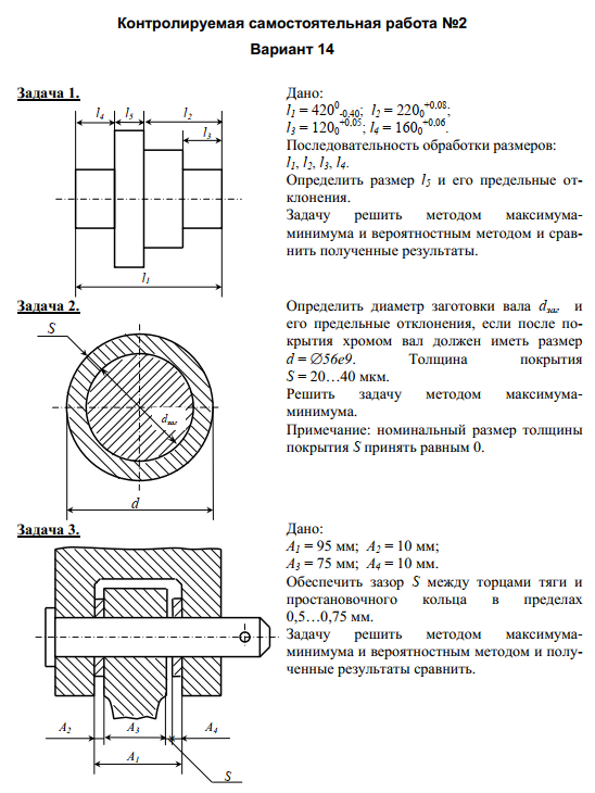 Контролируемая самостоятельная работа №2 Вариант 14 Задача 1. Дано: l 1 = 420 0-0,40 ; l 2 = 220 0+0,08 ; l 3 = 120 0+0,05 ; l 4 = 160 0+0,06 . Последовательность обработки размеров: l 1 , l 2 , l 3 , l 4 . Определить размер l 5 и его предельные отклонения. Задачу решить методом максимумаминимума и вероятностным методом и сравнить полученные результаты. Задача 2. Определить диаметр заготовки вала d заг и его предельные отклонения, если после по крытия хромом вал должен иметь размер d = 56е9 . S = 20…40 мкм. Толщина покрытия Решить задачу методом максимума минимума. Примечание: номинальный размер толщины покрытия S принять равным 0.