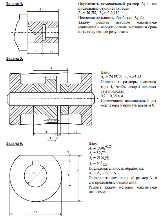 Задача 3. Дано: А 1 = 95 мм; А 2 = 10 мм; А 3 = 75 мм; А 4 = 10 мм. Обеспечить зазор S между торцами тяги и простановочного кольца в пределах 0,5…0,75 мм. Задачу решить методом максимумаминимума и вероятностным методом и полученные результаты сравнить. l 1 l 3 l 2 l 4 l 5 d d заг S А 2 А 4 А 3 А 1 S Задача 4. Определить номинальный размер L 2 и его предельные отклонения, если L 1 = 50 H8; L 3 = 2 0 h12 . Последовательность обработки: L 1 , L 2 . Задачу решить методом максимумаминимума и вероятностным методом и сравнить полученные результаты. Задача 5. Дано: А 1 = 70 H12; А 2 = 65 h8 . Определить размеры компенсатора А 3 , чтобы зазор S находился в пределах 0,2…0,35 мм.