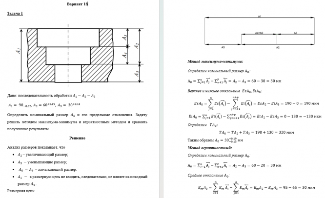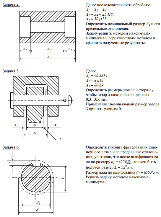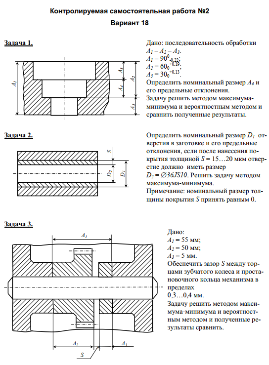 Контролируемая самостоятельная работа №2 Вариант 17 Задача 1. Дано: l 1 = 280 0-0,52 ; l 2 = 150 0+0,06 ; l 3 = 100 0+0,05 ; l 4 = 100 0+0,05 . Последовательность обработки размеров: l 1 , l 2 , l 3 , l 4 . Определить размер l 5 и его предельные отклонения. Задачу решить методом максимумаминимума и вероятностным методом и сравнить полученные результаты. Задача 2. Определить диаметр заготовки вала d заг и его предельные отклонения, если после по крытия хромом вал должен иметь размер d = 36x8 . S = 15…25 мкм. Толщина покрытия Решить задачу методом максимума минимума. Примечание: номинальный размер толщины покрытия S принять равным 0. Задача 3. Дано: А 1 = 60 мм; А 2 = 5 мм; А 3 = 50 мм; А 4 = 5 мм.