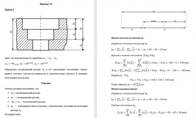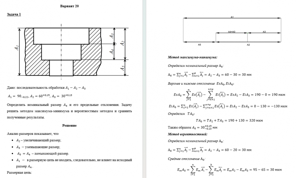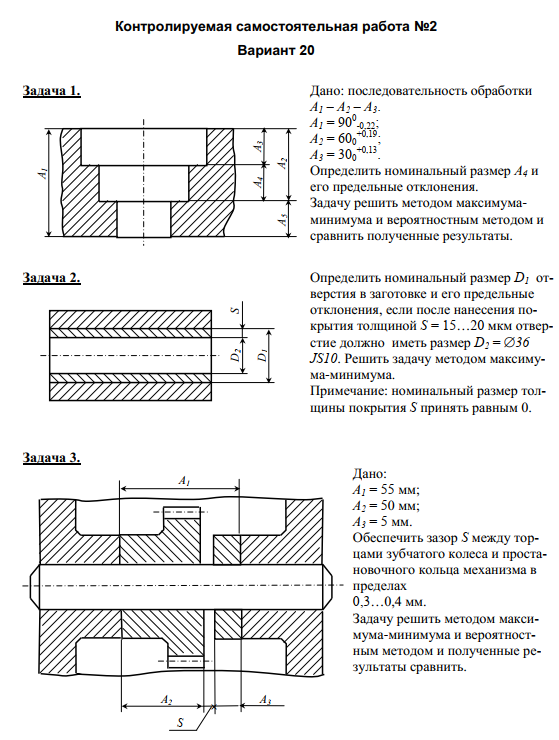 Контролируемая самостоятельная работа №2 Вариант 20 Задача 1. Дано: последовательность обработки А 1 – А 2 – А 3 . А 1 = 90 0-0,22 ; А 2 = 60 0+0,19 ; А 3 = 30 0+0,13 . Определить номинальный размер А 4 и его предельные отклонения. Задачу решить методом максимумаминимума и вероятностным методом и сравнить полученные результаты. Задача 2. Определить номинальный размер D 1 отверстия в заготовке и его предельные отклонения, если после нанесения покрытия толщиной S = 15…20 мкм отверстие должно иметь размер D 2 =  36 JS10 . Решить задачу методом максимума-минимума. Примечание: номинальный размер толщины покрытия S принять равным 0. Задача 3.
