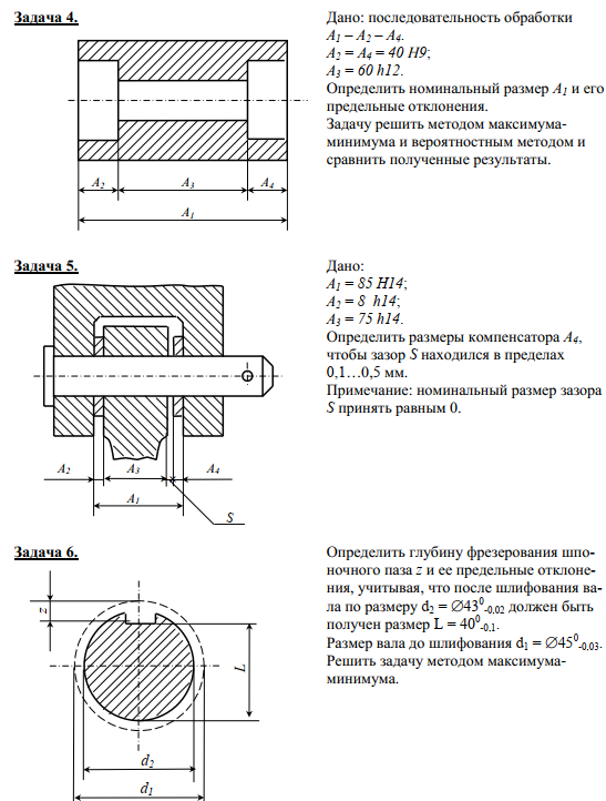 Определить размеры компенсатора А 4 , чтобы зазор S находился в пределах 0,1…0,5 мм. Примечание: номинальный размер зазора S принять равным 0. Задача 6. Определить глубину фрезерования шпоночного паза z и ее предельные отклонения, учитывая, что после шлифования вала по размеру d 2 =  43 0-0,02 должен быть получен размер L = 40 0-0,1 . Размер вала до шлифования d 1 =  45 0-0,03 . Решить задачу методом максимумаминимума .