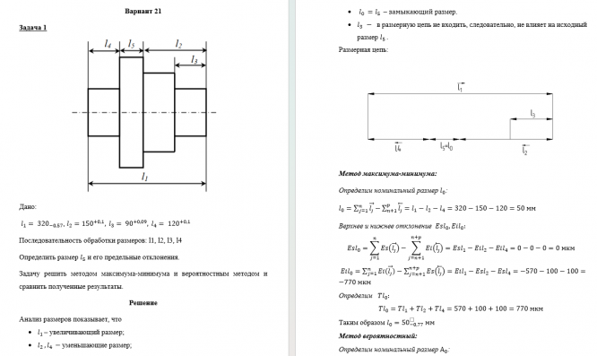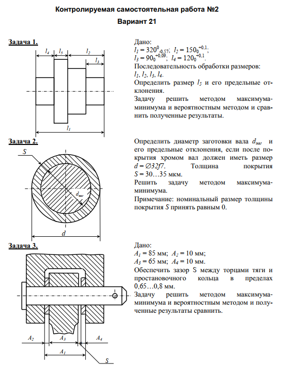 Контролируемая самостоятельная работа №2 Вариант 21 Задача 1. Дано: l 1 = 320 0-0,57 ; l 2 = 150 0+0,1 ; l 3 = 90 0+0,09 ; l 4 = 120 0+0,1 . Последовательность обработки размеров: l 1 , l 2 , l 3 , l 4 . Определить размер l 5 и его предельные отклонения. Задачу решить методом максимумаминимума и вероятностным методом и сравнить полученные результаты. Задача 2. Определить диаметр заготовки вала d заг и его предельные отклонения, если после по крытия хромом вал должен иметь размер d = 32f7 . S = 30…35 мкм. Толщина покрытия Решить задачу методом максимума минимума. Примечание: номинальный размер толщины покрытия S принять равным 0.
