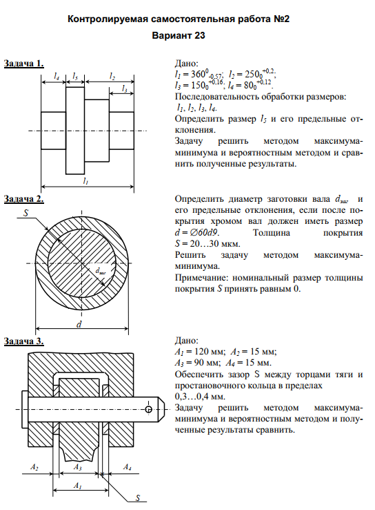 Контролируемая самостоятельная работа №2 Вариант 23 Задача 1. Дано: l 1 = 360 0-0,57 ; l 2 = 250 0+0,2 ; l 3 = 150 0+0,16 ; l 4 = 80 0+0,12 . Последовательность обработки размеров: l 1 , l 2 , l 3 , l 4 . Определить размер l 5 и его предельные отклонения. Задачу решить методом максимумаминимума и вероятностным методом и сравнить полученные результаты. Задача 2. Определить диаметр заготовки вала d заг и его предельные отклонения, если после по крытия хромом вал должен иметь размер d = 60d9 . S = 20…30 мкм. Толщина покрытия Решить задачу методом максимума минимума. Примечание: номинальный размер толщины покрытия S принять равным 0.