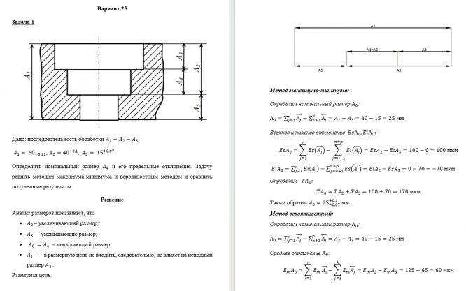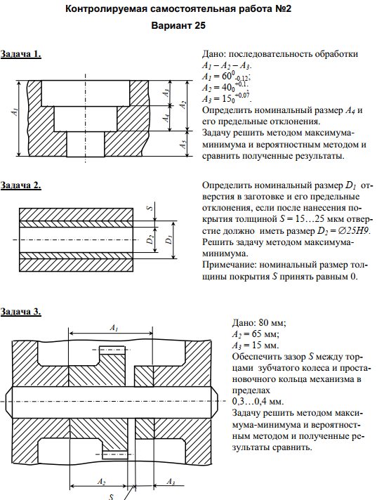 Контролируемая самостоятельная работа №2 Вариант 25 Задача 1. Дано: последовательность обработки А 1 – А 2 – А 3 . А 1 = 60 0-0,12 ; А 2 = 40 0+0,1 ; А 3 = 15 0+0,07 . Определить номинальный размер А 4 и его предельные отклонения. Задачу решить методом максимумаминимума и вероятностным методом и сравнить полученные результаты. Задача 2. Определить номинальный размер D 1 отверстия в заготовке и его предельные отклонения, если после нанесения покрытия толщиной S = 15…25 мкм отверстие должно иметь размер D 2 = 25H9 . Решить задачу методом максимумаминимума. Примечание: номинальный размер толщины покрытия S принять равным 0. Задача 3. Дано: 80 мм; А 2 = 65 мм; А 3 = 15 мм.