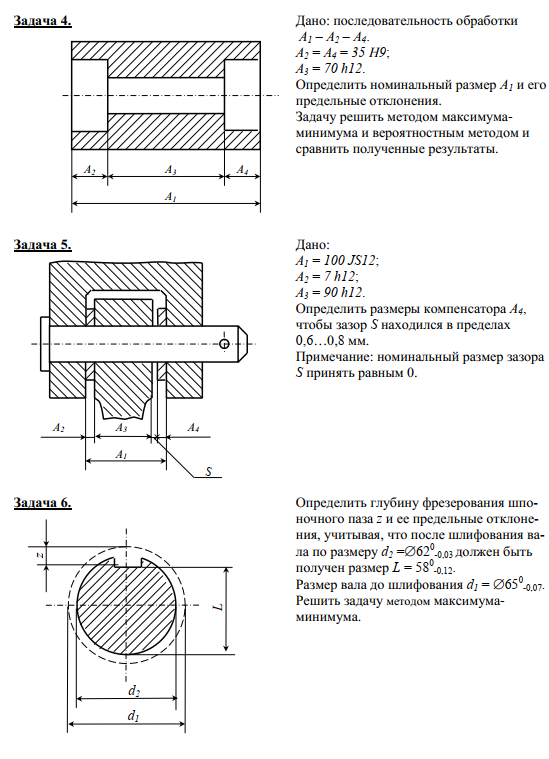 Обеспечить зазор S между торцами зубчатого колеса и простановочного кольца механизма в пределах 0,3…0,4 мм. Задачу решить методом максимума-минимума и вероятностным методом и полученные результаты сравнить. А 4 А А 3 2 А 5 А 1 D 2 D 1 S А 2 А 3 А S 1 Задача 4. Дано: последовательность обработки А 1 – А 2 – А 4 . А 2 = А 4 = 35 Н9 ; А 3 = 70 h12 . Определить номинальный размер А 1 и его предельные отклонения. Задачу решить методом максимумаминимума и вероятностным методом и сравнить полученные результаты. Задача 5. Дано: А 1 = 100 JS12 ; А 2 = 7 h12 ; А 3 = 90 h12 . Определить размеры компенсатора А 4 , чтобы зазор S находился в пределах 0,6…0,8 мм. Примечание: номинальный размер зазора S принять равным 0.