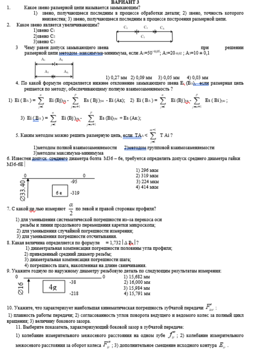1. Чему равен допуск замыкающего звена при решении размерной цепи методом максимума-минимума, если А1=50+0,05; А2=20-0,02 ; А3=10 ± 0,1