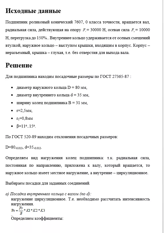Подшипник роликовый конический 7607, 0 класса точности, вращается вал, радиальная сила, действующая на опору = 30000 Н, осевая сила = 10000 Н, перегрузка до 150%.. Внутреннее кольцо удерживается от осевых смещений втулкой, наружное кольцо – выступом крышки, входящим в корпус. Корпус – неразъемный, крышка – глухая, т.е. без отверстия для выхода вала.