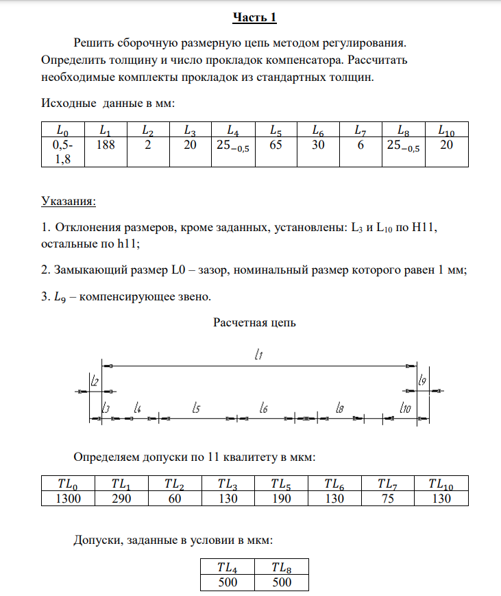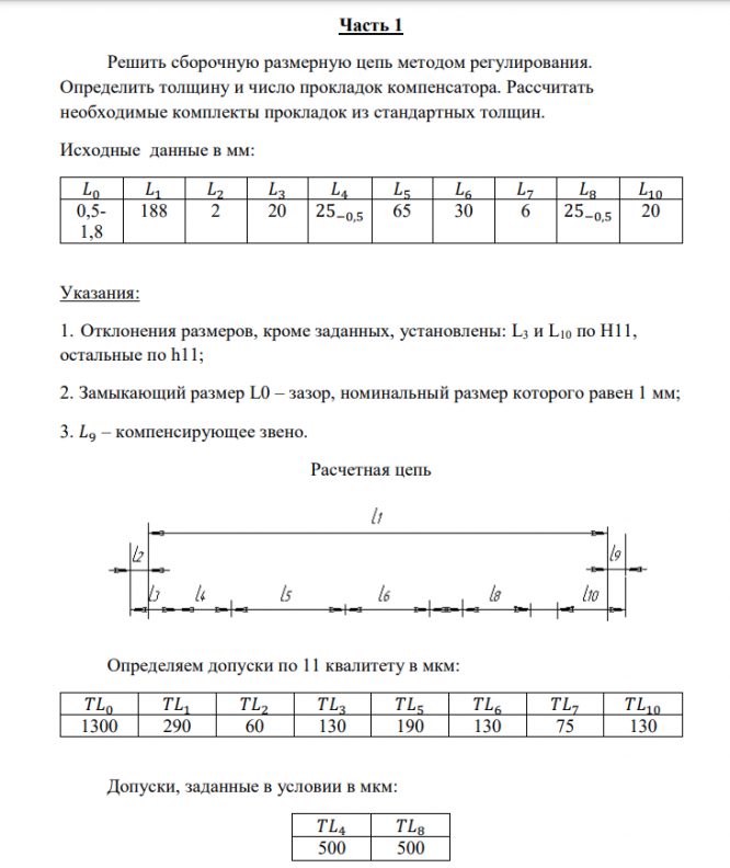 Часть 1 Решить сборочную размерную цепь методом регулирования. Определить толщину и число прокладок компенсатора. Рассчитать необходимые комплекты прокладок из стандартных толщин.