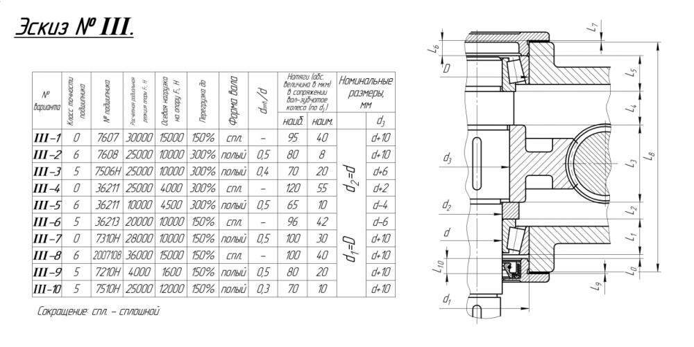 Вал не имеет уступа, полый с диаметром отверстия dотв = 0.4d. Внутреннее кольцо удерживается от осевых смещений втулкой, наружное кольцо – выступом крышки, входящим в корпус. Корпус – неразъемный, крышка – глухая, т.е. без отверстия для выхода вала.