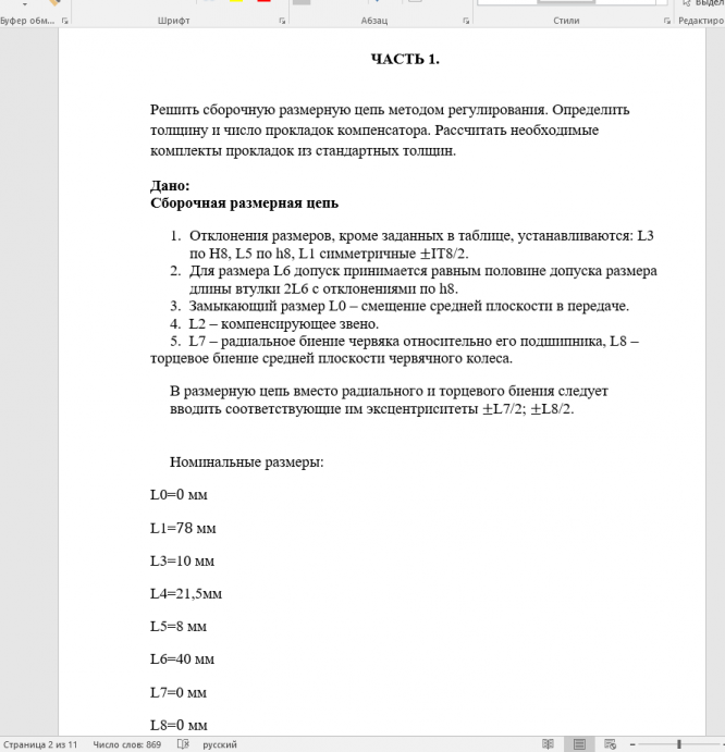 Расчётно-графическая работа №2 по Метрологии Эскиз 1 Вариант 6 РЛ6-41 ЧАСТЬ 1. Решить сборочную размерную цепь методом регулирования. Определить толщину и число прокладок компенсатора. Рассчитать необходимые комплекты прокладок из стандартных толщин. Дано: Сборочная размерная цепь Отклонения размеров, кроме заданных в таблице, устанавливаются: L3 по Н8, L5 по h8, L1 симметричные IT8/2. Для размера L6 допуск принимается равным половине допуска размера длины втулки 2L6 с отклонениями по h8. Замыкающий размер L0 – смещение средней плоскости в передаче. L2 – компенсирующее звено. L7 – радиальное биение червяка относительно его подшипника, L8 – торцевое биение средней плоскости червячного колеса.