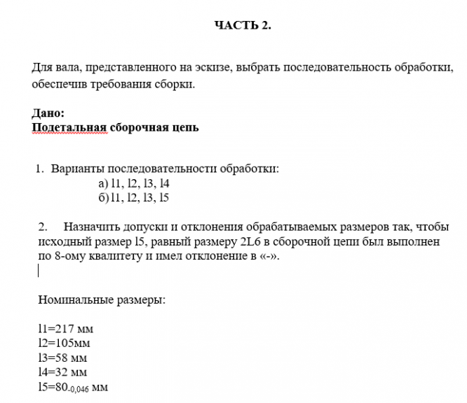 В размерную цепь вместо радиального и торцевого биения следует вводить соответствующие им эксцентриситеты L7/2; L8/2. Номинальные размеры: L0= мм L1= мм L3=10 мм L4=21,5мм L5=8 мм L6=40 мм L7=0 мм L8= мм ЧАСТЬ 2. Для вала, представленного на эскизе, выбрать последовательность обработки, обеспечив требования сборки. Дано: Подетальная сборочная цепь Варианты последовательности обработки: а) l1, l2, l3, l4 б) l1, l2, l3, l5 Назначить допуски и отклонения обрабатываемых размеров так, чтобы исходный размер l5, равный размеру 2L6 в сборочной цепи был выполнен по 8-ому квалитету и имел отклонение в «-». Номинальные размеры: l1=217 мм l2=105мм l3=58 мм l4=32 мм l5=80-0,046 мм .