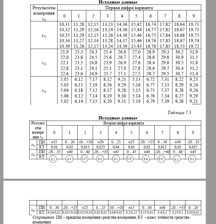 Показать/скрыть дополнительное описаниеОбработка косвенных измерений. Определение параметра Z = f(х1, х2, х3) проводится с помощью прямых многократных измерений параметров х1, х2, х3, для каждого из которых известны основные метрологические характеристики применяемых средств измерений – пределы измерений (ПИ) и класс точности (КТ). Требуется: провести обработку результатов измерений; найти суммарную погрешность косвенного измерения параметра Z измерения c доверительной вероятностью Р = 95 %..