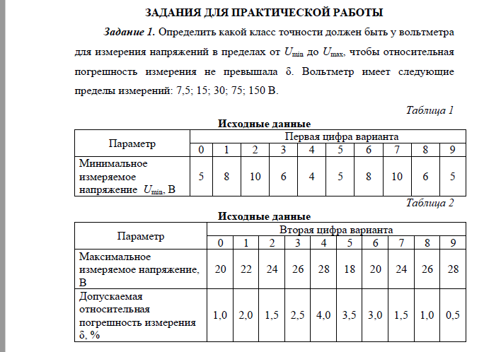 Показать/скрыть дополнительное описаниеВыбор средств измерений.Определить какой класс точности должен быть у вольтметра для измерения напряжений в пределах от Umin до Umax, чтобы относительная погрешность измерения не превышала δ. Вольтметр имеет следующие пределы измерений: 7,5; 15; 30; 75; 150 В. Предполагаемый диапазон измеряемых действующих значений периодического напряжения электрической сети составляет Umin до Umax.. Номинальная частота измеряемого напряжения равна Т. Температура в эксперименте предполагается не выше t. Необходимо определить какой из представленных приборов (таб. 4) подходит для измерения статического напряжения, если суммарная инструментальная относительная погрешность измерения должна быть не более δ %..