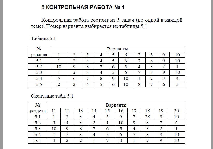 Контрольная работа состоит из 5 задач (по одной в каждой теме). Номер варианта выбирается из таблицы 5.1