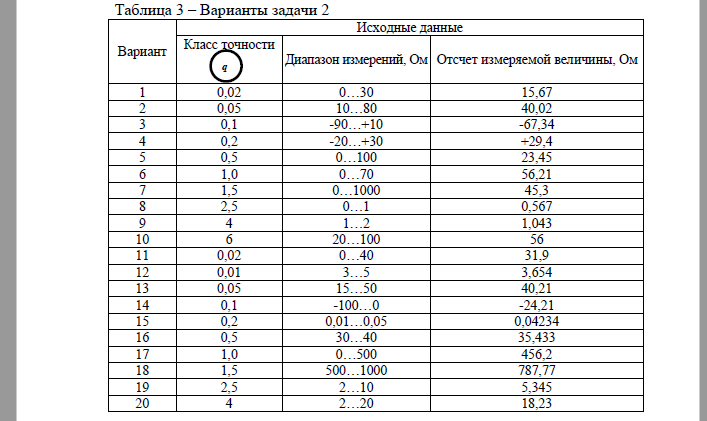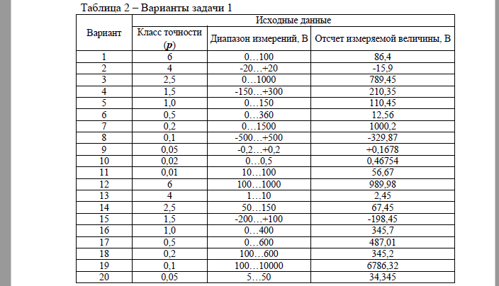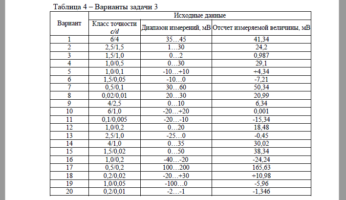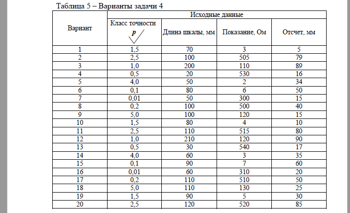 Показать/скрыть дополнительное описаниеКнАНУ; Расчётно-графическая работа. Основы метрологии, стандартизации, сертификациии контроля качества Задачи 1 – 3. Исходными данными для задач 1 – 3 являются: 1. Класс точности СИ; 2. Диапазон измерений СИ; 3. Отсчет измеряемой величины (показание СИ). Требуется: 1. определить абсолютную, относительную и приведенную погрешности результата измерения; 2. записать результат измерения с указанием его погрешности; 3. построить графики абсолютной, относительной и приведенной погрешностей на диапазоне измерений. Задача 4. Исходными данными для задачи 4 являются: 1. Класс точности СИ; 2. Длина шкалы СИ; 3. Отсчет в единицах длины шкалы; 4. Отсчет измеряемой величины (показание СИ).