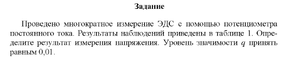 Проведено измерение ЭДС с помощью потенциометра постоянного тока. Результаты наблюдений приведены в таблице 1. Определите результат измерения напряжения. Уровень значимости q принять равным 0,01.