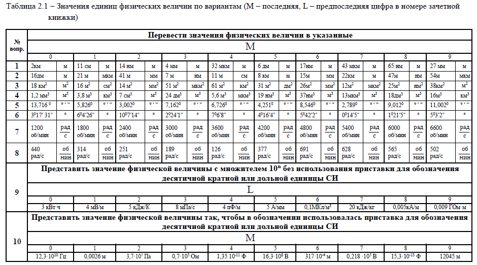 Перевести значения единиц физических величин по вариантам таблицы 2.1. Ответы свести в таблицу 2.2.
