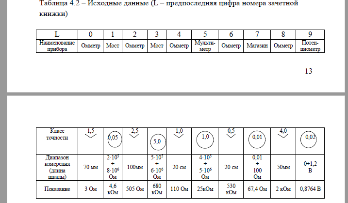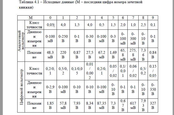 Оценка результата при прямых однократных измерениях Для трех приборов: - аналогового вольтметра (данные в таблице 4.1); - цифрового вольтметра (данные в таблице 4.1); - третьего прибора, выбираемого по таблице 4.2, определить пределы допустимой погрешности средства измерения Θии записать действительное значение величины Хд согласно правилам округления. Исходные данные по варианту и результаты решения свести в таблицу 4.3..