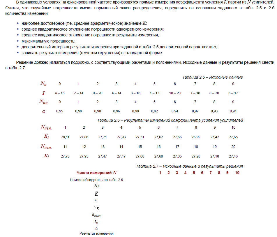 В одинаковых условиях на фиксированной частоте производятся прямые измерения коэффициента усиления К партии из N усилителей.Считая, что случайные погрешности имеют нормальный закон распределения, определить на основании заданного в табл. 2.5 и 2.6 количества измерений: