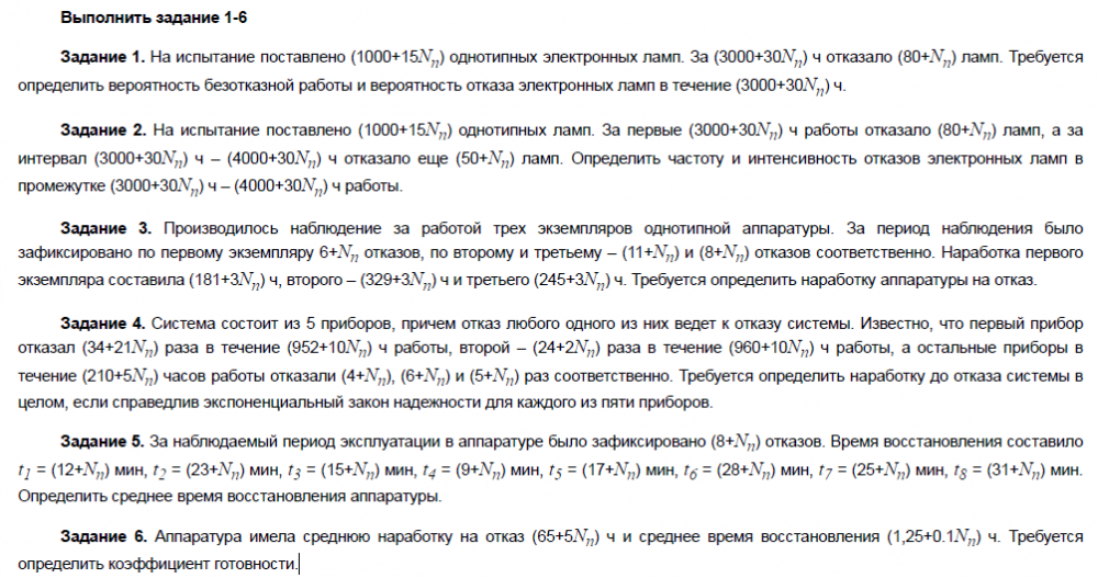 Показать/скрыть дополнительное описаниеЛабораторная работа №4. Надежность приборов и систем На испытание поставлено (1000+15) однотипных электронных ламп. За (3000+30) ч отказало (80+) ламп. Требуется определить вероятность безотказной работы и вероятность отказа электронных ламп в течение Определить частоту и интенсивность отказов электронных ламп. Требуется определить наработку аппаратуры на отказ. Система состоит из 5 приборов, причем отказ любого одного из них ведет к отказу системы. Требуется определить наработку до отказа системы в целом, если справедлив экспоненциальный закон надежности для каждого из пяти приборов. Определить среднее время восстановления аппаратуры Требуется определить коэффициент готовности.