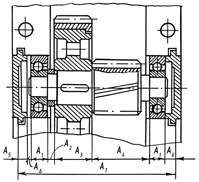 При решении этой задачи требуется выполнить проектный расчет размерной цепи методом максимума-минимума, определяющий величину зазора АD между торцами крышки и наружного кольца подшипника