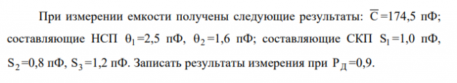При измерении емкости получены следующие результаты: С =174,5 пФ; составляющие НСП 1=2,5 пФ, 2 =1,6 пФ; составляющие СКП S1=1,0 пФ, S2 =0,8 пФ, S3 =1,2 пФ. Записать результаты измерения при РД =0,9.