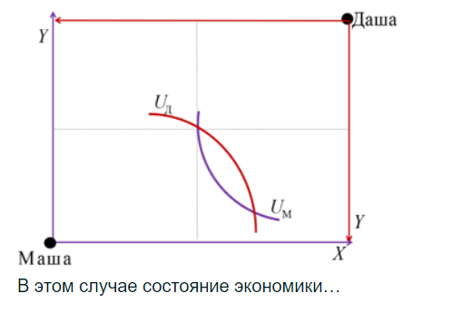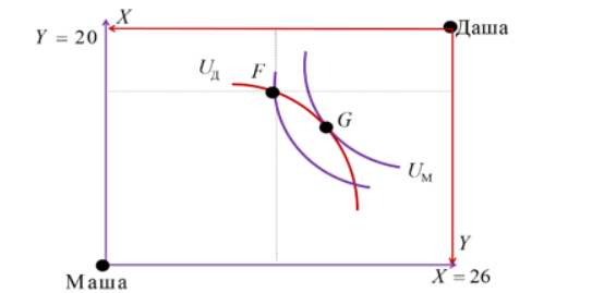 На рисунке представлены коробка Эджуорта и распределение двух благ между Машей и Дашей.