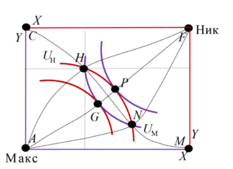 На рисунке представлена точка исходного распределения ресурсов Н.