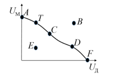 На рисунке представлена кривая потребительских возможностей, где по оси абсцисс располагается полезность Даши, а по оси ординат – полезность Маши.