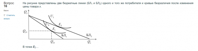На рисунке представлены две бюджетные линии (БЛ1 и БЛ2) одного и того же потребителя и кривые безразличия после изменения цены товара х.
